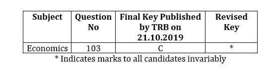 Subject Economics vide Notification No. 10/2019, Dated: 12.06.2019 For the direct recruitment of 220 Post Graduate Assistants in Economics, examination was held on 27.09.2019. Final Key and Mark List was published on 21.10.2019 and the Provisional Selection List was published on 03.01.2020. Some representations were received by the Board challenging the Key of Question No 103. The Board considered the representation and revised the Final Key as follows