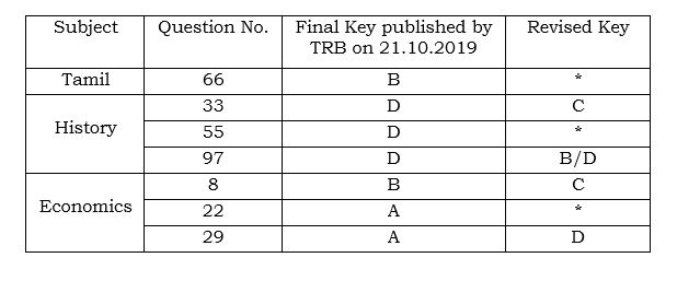 List of certificate verification and provisional selection list for the subjects Tamil, History and Economics vide Notification No. 10/2019, Dated: 12.06.2019 For the Direct Recruitment of 2144 Post Graduate Assistants / Physical Education Directors Grade-I, the examination were held on 27.09.2019, 28.09.2019 and 29.09.2019. The results were published on 18.10.2019 and 21.10.2019 and the certificate verification was conducted on 08.11.209 and 09.11.2019. The Board already released the provisional selection list for 12 subjects on 20.11.2019 except Tamil, History and Economics for the School Education department. Meanwhile, some writ petitions were filed in the Hon’ble High Court of Madras and representations were received from the candidates for non selection. Based on the Court direction and genuinity of the representation, the Board decided to modify the selection list for the subjects Mathematics and Physical Director Grade-I. The modified provisional selection list for the above two subjects were published herewith. Some writ petitions also filed challenging the final key answers published by the Teachers Recruitment Board in the subjects Tamil, History and Economics. In that writ petitions the Hon’ble High Court directed the Board, to constitute a expert committee and the committee should consider the representation/objection for the key answers received from the candidates till 29.11.2019 and take a final decision. As per the recommendation of the expert committee for the above 3 subjects and revised final key were arrived. The changes in three subjects are as follows.